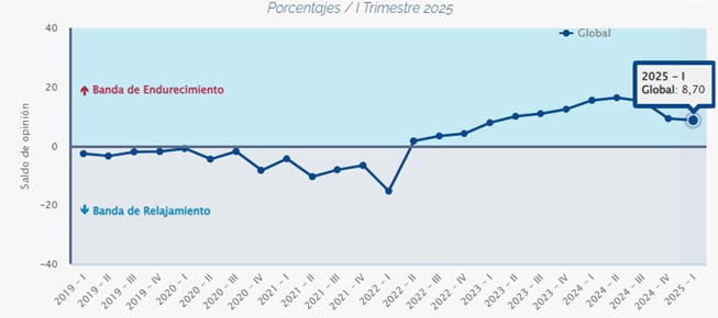 Según el Banco Central del Ecuador[1], durante el primer trimestre de 2025, el 8,70% de las entidades financieras reportó un endurecimiento de las condiciones de crédito, porcentaje levemente inferior al observado en el trimestre previo (9,27%), como se muestra en la siguiente Figura: